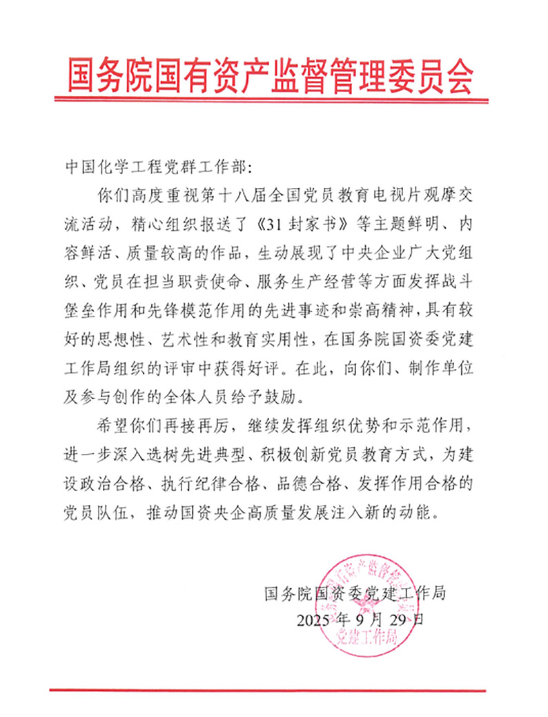 近日,由米兰平台原创的党员教育片《31封家书》再传捷报!该作品经中国化学工程集团有限公司党委推荐,参与中央组织部第十八届全国党员教育电视片观摩交流活动,并获得国务院国资委党委的高度评价,专门发来鼓励函予以表彰。这一荣誉不仅是对作品艺术价值的肯定,更是对中国化学三化建人“家国情怀”与“硬核担当”的生动诠释。