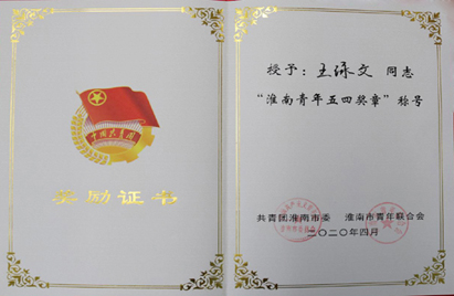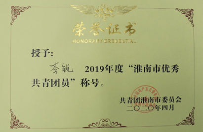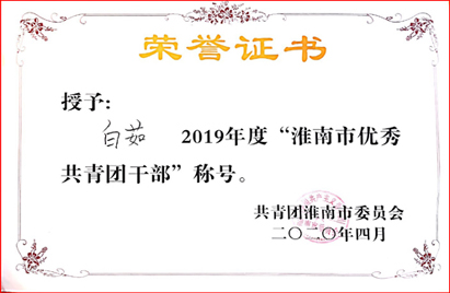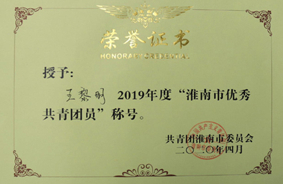 共青团淮南市委员会日前对第九届“淮南青年五四奖章”和2019年度“淮南市优秀共青团员”、“淮南市优秀共青团干部”、“淮南市五四红旗团(工)委”、“淮南市五四红旗团支部(总支)”进行了表彰。重庆分公司王泳文同志荣获第九届“淮南青年五四奖章”称号;贵州分公司李锐、公司安全监督部王黎明两名同志荣获“淮南市优秀共青团员”称号,机械化工程公司白茹同志荣获“淮南市优秀共青团干部”称号,公司技术研发中心项目经理部团支部、安装工程九公司团支部荣获“淮南市五四红旗团支部”称号。