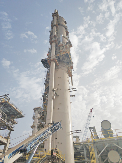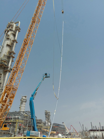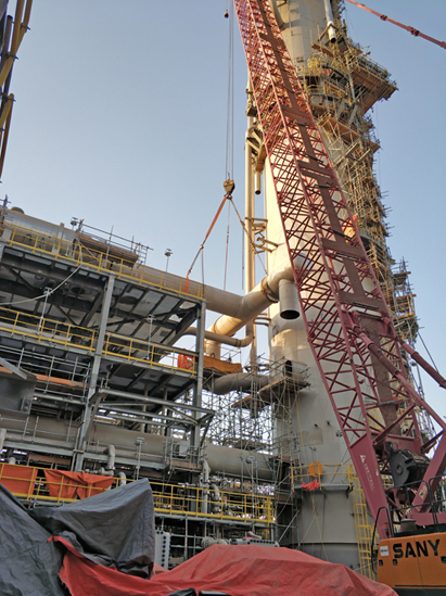 疫情发生以来,现场人员、机械等资源使用受到很大限制,土建单位停工造成了场地不具备安装条件。项目队优化人力资源组合,科学规划作业内容。技术人员对施工方案、作业流程以及可能出现的各种状况进行充分探讨、论证,准备了各类预案,保障了施工顺利完成。例如,在场地受限、大型吊装机械无法满足数量要求,且唯一一台大吊车无法到达最优作业位置的情况下,项目队仍然成功完成70多米再生塔顶层超大平台跨主管廊安装。此外,由于设计理念的原因,现场工艺设备口配管几乎均为焊接型,且大部分具有特殊角度,大大增加了作业难度。技术人员积极与总包探讨,据理力争,通过增加焊口,或者修改现场口位置,甚至将已完成的预制口切口、避开特殊角度等方式,成功完成100多米洗涤塔多条超高空大口径附塔管及异形大口径管段安装等多项重难点施工任务。