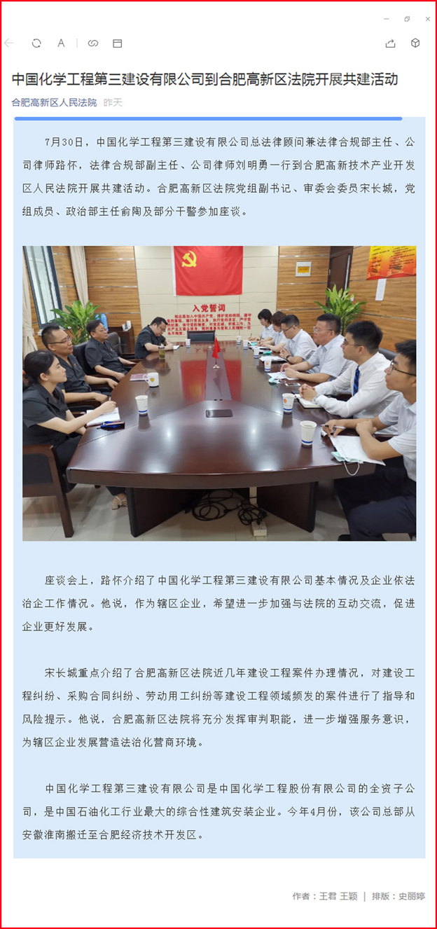 合肥高新区人民法院微信公众号7月30日对公司与合肥高新区法院开展法企共建活动进行了宣传报道。