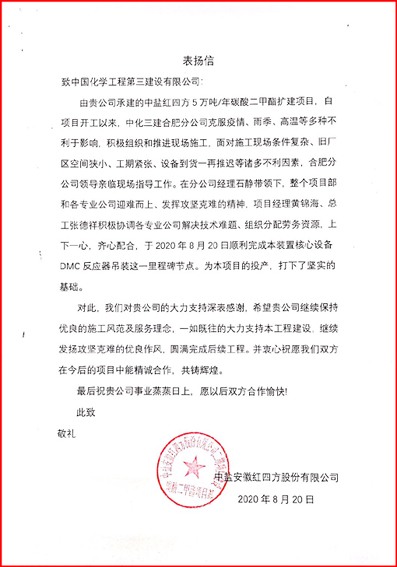 8月20日,中盐安徽红四方股份有限公司给公司发来表扬信,对合肥直属项目经理部8月20日顺利完成中盐安徽红四方5万吨/年碳酸二甲酯扩建项目核心设备DMC反应器吊装这一里程碑节点予以表扬。