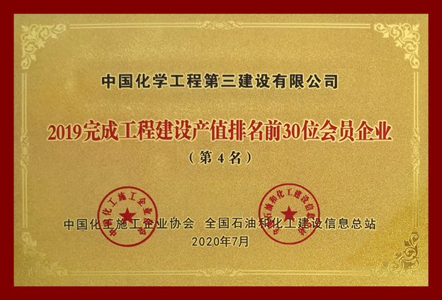 2019年,全国化工建设行业积极应对国内外复杂多变的经济环境和各种严峻挑战,行业发展规模不断扩大,发展质量不断提高。为进一步弘扬行业先进,推进行业持续健康发展,中国化工施工企业协会、全国石油和化工建设信息总站日前联合开展2019年度“全国化工建设行业企业生产规模年度排名”活动,公司凭借2019年度主营业务收入,荣获“2019年完成工程建设产值排名前30位会员企业(第4名)”。