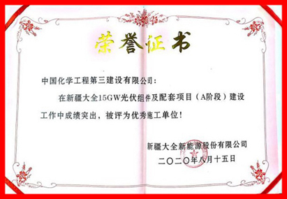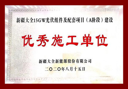 新疆大全新能源股份有限公司日前举行15GW光伏组件及配套项目(A阶段)表彰活动。公司新疆分公司在现场7家施工单位中脱颖而出,荣获“优秀施工单位”称号。