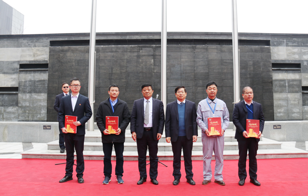 在激扬的乐曲和热烈的掌声中,公司党委书记黄庆平,总经理、党委副书记潘来安共同为《筑梦辉煌—中化三建发展史略》揭幕,并为大国工匠、劳动模范、优秀党员、优秀团员代表授书。