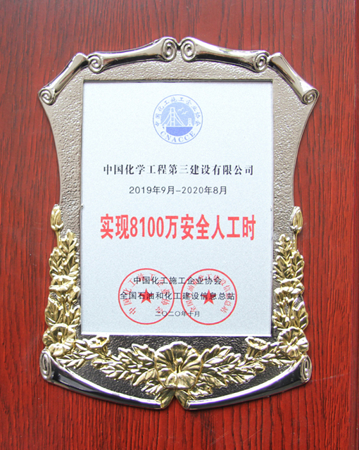 中国化工施工企业协会2020年年会暨全国化工企业搬迁、装备再制造高峰论坛12月8号在山东肥城召开。会上,公司获得“2019年9月—2020年8月实现8100万安全人工时”奖牌。