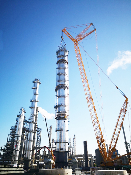2020年12月31日,青岛分公司使用利勃海尔750吨履带吊,将山东淄博汇丰石化项目丙烷丙烯分离塔最后一段安全稳妥吊装就位,按期完成节点任务,受到业主、监理一致好评,为2021年元旦献上了一份贺礼。