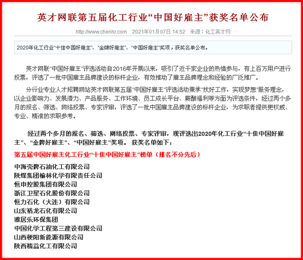 元月7日,英才网联2020年“中国好雇主”名单新鲜出炉,公司荣获“化工行业十佳中国好雇主”称号。
