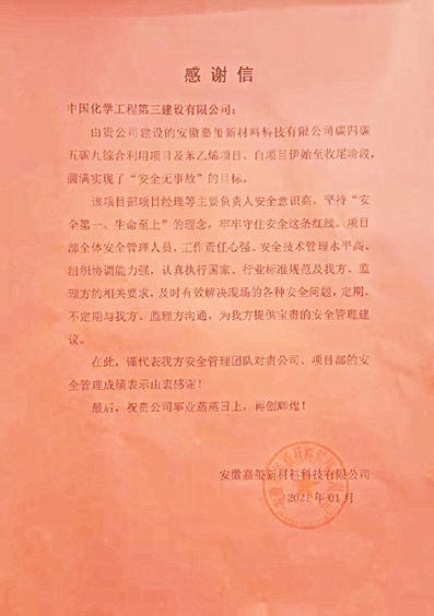 安徽嘉玺新材料科技有限公司近日给公司发来感谢信,对公司淮南化工园工程项目经理部承建的安徽嘉玺新材料科技有限公司C4/C5、C9综合利用及苯乙烯项目圆满实现“安全无事故”目标表示衷心感谢。