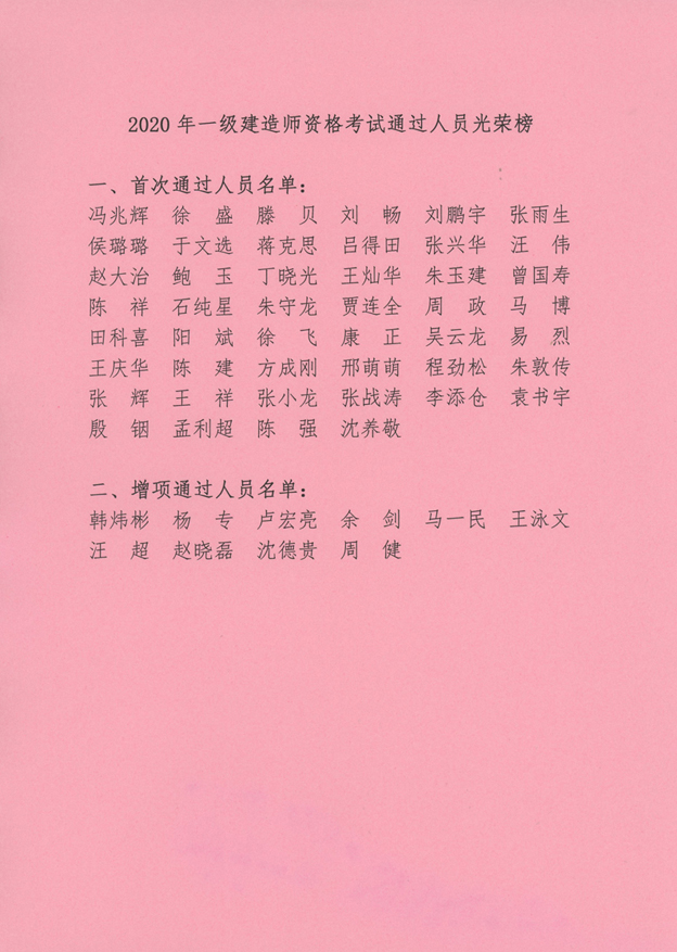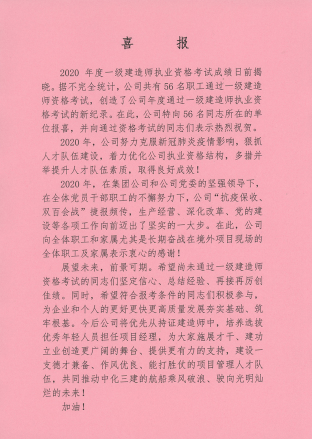 2020年度一级建造师执业资格考试成绩日前揭晓。据不完全统计,公司共有56名职工通过一级建造师资格考试,创造了公司年度通过一级建造师执业资格考试的新纪录。在此,公司特向56名同志所在的单位报喜,并向通过资格考试的同志们表示热烈祝贺。