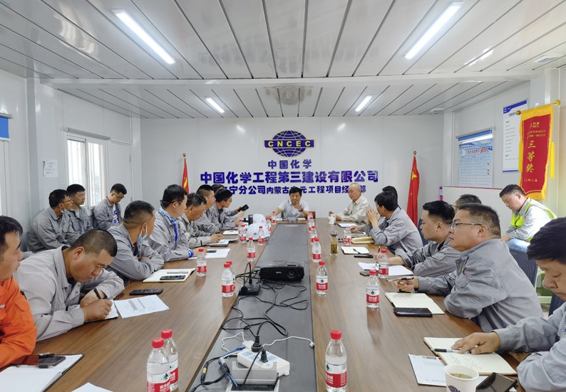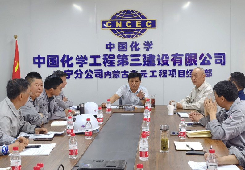 潘来安总经理查看了现场,与业主高层进行了会晤,并主持召开安装工程大干动员会,听取了北京分公司、内蒙古分公司负责人关于项目运行情况及下一步安排的工作汇报,就切实组织好鑫元颗粒硅安装工程大干提出六点要求。一是要提高站位,从践行“双碳”战略的高度,进一步提高干好多晶硅等新能源项目重要性的认识。要高度重视与协鑫集团的长期合作,切实增强服务意识,干好在手项目。二是要高效组织,多晶硅项目具有工期紧、施工高峰期长等特点,要合理统筹安排,避峰错谷调配资源,确保项目工期。三是要密切配合,合理安排各专业间的平行和交叉作业,各工序要有序衔接,确保项目建设平稳有序,提高效率。四是要安全生产,严格落实高空作业安全防护措施,安排专人旁站监管,责任到人,认真履职。五是要配足防暑降温用品,制定可行的应急措施,保证项目建设安全平稳推进。六是各单位、各层级要加强沟通协作,形成攻坚合力,打出中化三建声誉和品牌。