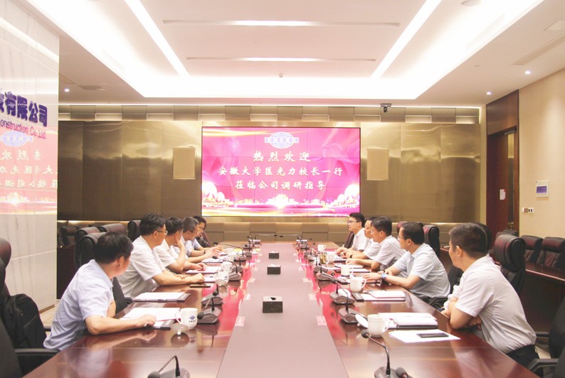 8月24日,公司党委书记、董事长占德庆在总部合肥会见安徽大学匡光力校长一行,并为安徽大学、中化三建“就业实习基地”揭牌。
