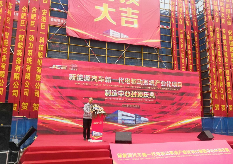 国庆到来之际,公司承建的安徽巨一科技股份有限公司新能源汽车新一代电驱动系统产业化项目制造中心举行封顶庆典,公司副总经理梁华金出席庆典并致辞。