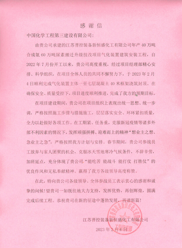 近日,江苏晋控装备新恒盛化工有限公司给公司发来感谢信,对公司安全优质高效完成其年产40万吨合成氨、60万吨尿素搬迁升级技改项目气化装置40米主体框架封顶表示衷心感谢。