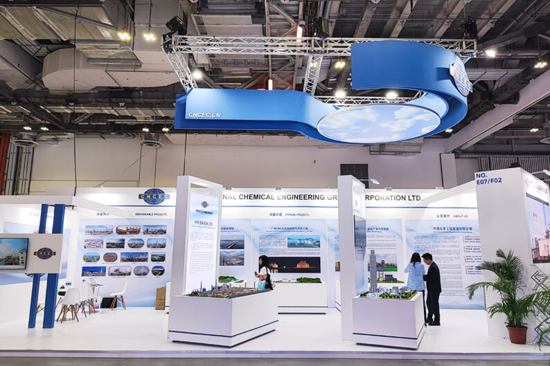 新加坡有限公司克服时间紧、任务重、首次承办等因素影响,严格按照集团公司布展方案,组织精干力量,积极对接大会组委会,调研听取各方面意见建议,历时一个月圆满完成布展方案执行、展位搭建协调、沙盘仓储转运等各项任务,并积极做好商务接待、企业外宣等一系列工作。展览以“数字经济”和“绿色发展”为主题,通过图文讲解、视频展示、模型及装备展览等方式,向新加坡各界全面展示了中国化学近年来取得的丰硕成果与技术活力,受到广泛好评。