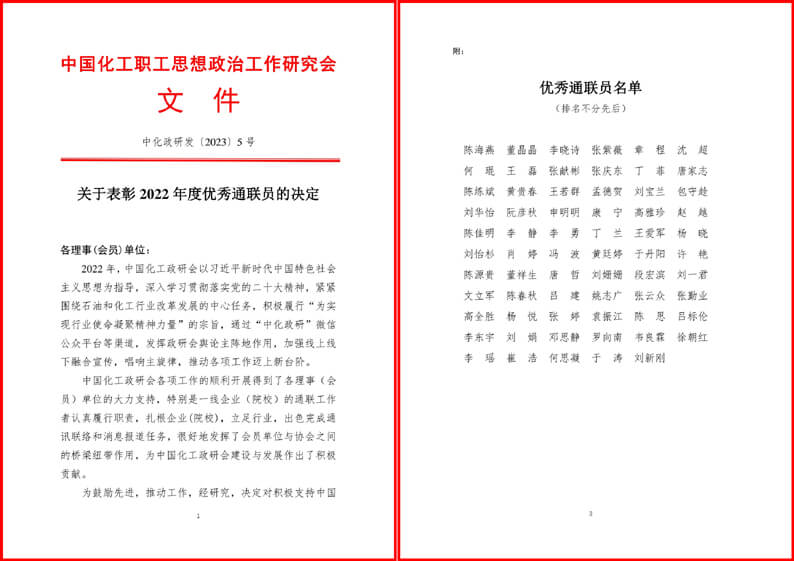 近年来,公司坚持以习近平新时代中国特色社会主义思想为指引,深入学习贯彻落实党的二十大精神,积极传播新发展理念,与人民网、中化政研会等主流媒体加强沟通联系,逐步形成常态长效对外宣传机制,为传播“中化三建品牌”、讲好“中化三建故事”起到了积极推动作用。公司将以此次参训及获奖为契机,紧紧围绕石油和化工行业改革发展中心任务,积极履行“为实现行业使命凝聚精神力量”宗旨,充分发挥 “中化政研”等舆论主阵地作用,加强线上线下融合宣传,唱响主旋律,不断开创宣传思想工作新格局,为公司加快打造“两商”、建设“一流”,推进党建和宣传思想工作高质量可持续发展蓄势添能,以实际行动和优异成绩向集团公司成立70周年献礼。