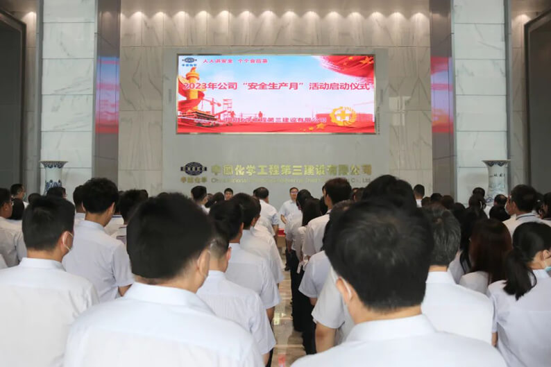 启动仪式上,作为公司安全生产主要责任人,占德庆董事长从五个方面作出郑重承诺。一是提高站位,带头学习贯彻习近平总书记关于安全生产的重要论述。坚持“人民至上、生命至上”,坚持统筹发展和安全,以非常明确、非常强烈、非常坚定的态度,牢固树立“安全生产底线、红线、生命线”理念,以强烈的政治意识、大局意识、责任意识,坚持高标准、严要求、硬约束,采取有力措施,筑牢安全生产防线,坚决杜绝生产安全责任事故。二是依法履职尽责,带头落实全员安全生产岗位责任制。带头遵法、学法、守法,严格履行法定安全生产职责,切实担起“第一责任人”责任。以“时时放心不下”的责任感,按照“党政同责、一岗双责、失职追责、齐抓共管”和“管行业必须管安全、管业务必须管安全、管生产经营必须管安全”的原则,严格落实安全生产领导责任。三是打造本质安全,带头组织开展重大事故隐患排查整治。严格落实“安全生产十五条措施”,持续推进安全管理强化年行动和重大事故隐患专项排查整治2023行动,聚焦危险性较大的分部分项工程、特种设施设备、动火、受限空间、起重吊装、交叉作业等高风险事故隐患,实时开展全覆盖、拉网式、地毯式安全隐患大排查,着力从根本上消除事故隐患、从根本上解决问题,推动安全生产治理模式向事前预防转型,提升本质安全管理水平。四是健全应急救援体系,带头组织开展事故应急救援演练活动。结合重大安全风险和潜在自然灾害风险,带头组织研究应急救援预案,开展应急救援演练,检验应急预案的有效性,切实提高员工防范自救互救能力。进一步加强与当地政府、消防、医疗机构等社会力量协调联动,健全完善信息预警沟通机制,推动建立统一指挥、规范有序、反应快捷、科学高效的应急管理体系。五是营造浓厚氛围,推动全员安全意识再提升。推动各单位广泛组织开展全员参与、形式多样、富有特色的“安全生产月”活动和“安全宣传咨询日”活动;开展安全生产法普法宣传教育和安全生产警示教育,大力营造“人人讲安全,人人会应急”的浓厚氛围。