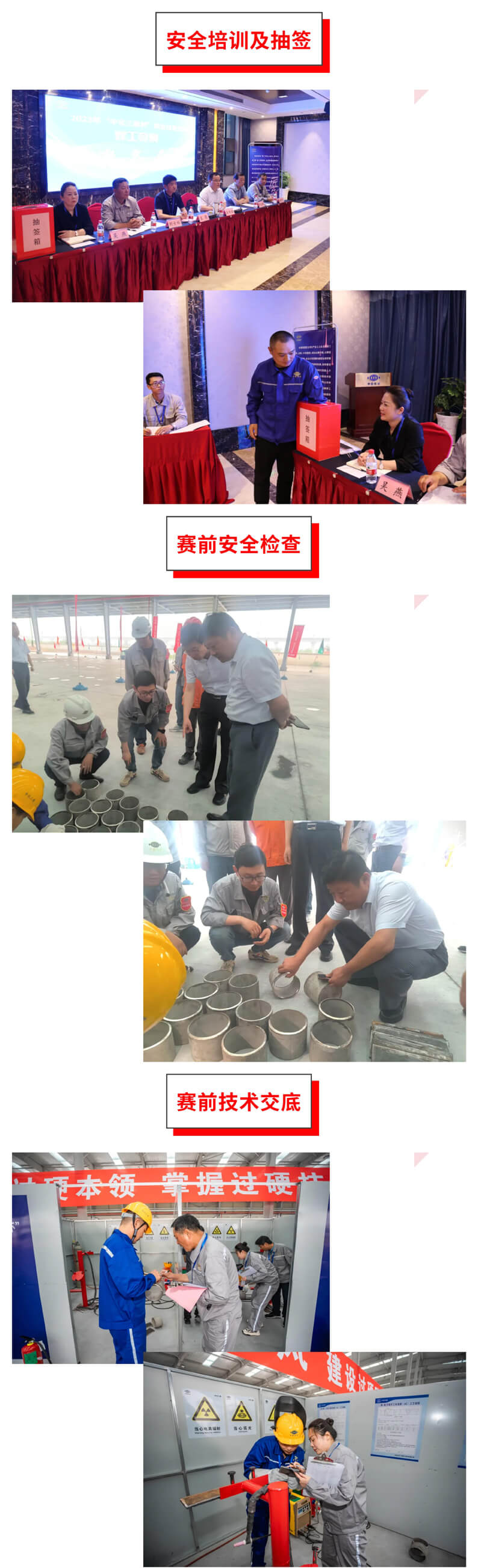 竞赛前,组织进行了安全培训,并通过抽签确定了3个实操比赛分组和个人对应工位、试件号。潘来安总经理、顾士新副书记、潘新宇总工程师带领安保组成员提前抵达实操比赛现场,认真检查了试件准备、工机具摆放、电源设置、地面整洁、灭火器布置等情况,确保符合比赛要求。