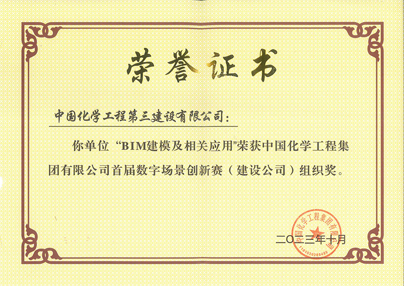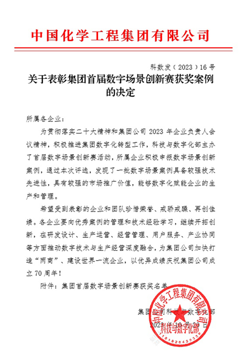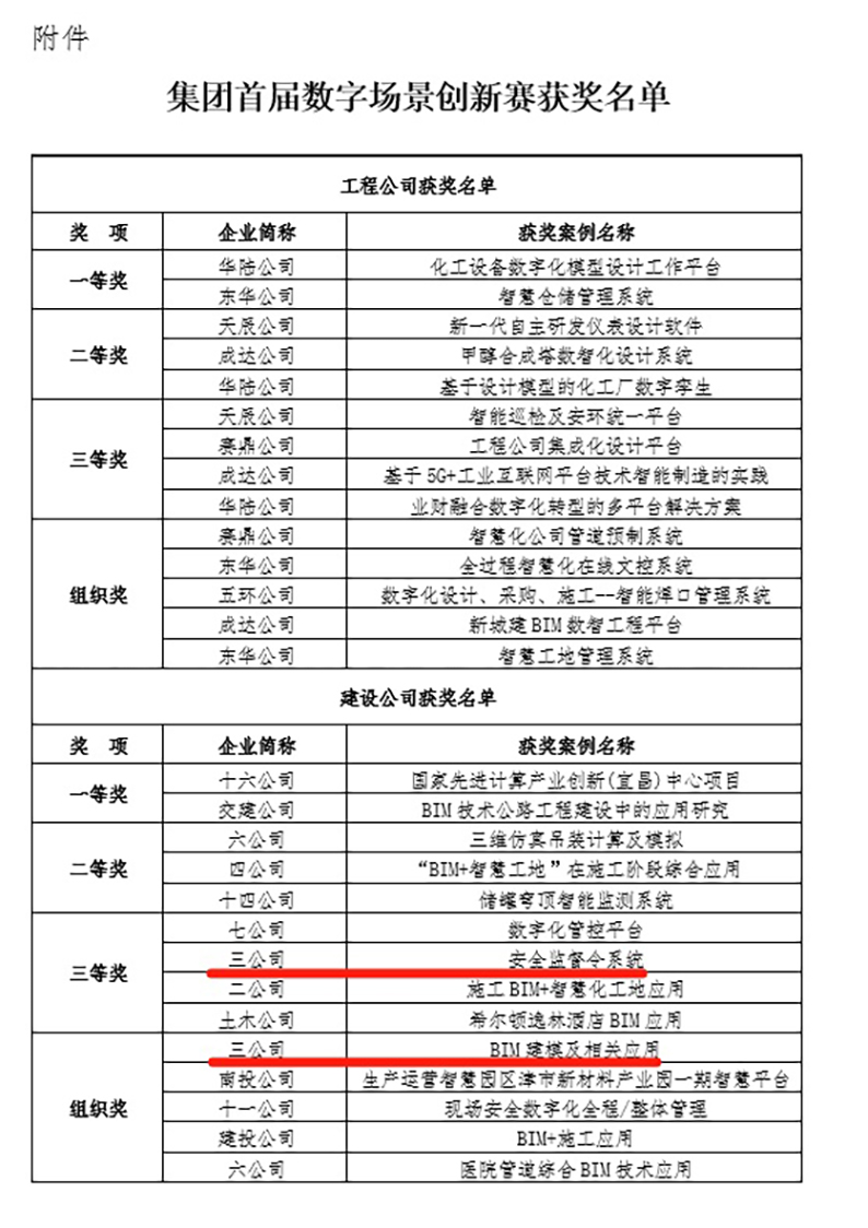近日,在中国化学2023年数字化转型与网络安全研讨会上,公司申报的“安全监督令系统”和“BIM建模及相关应用”案例分别荣获中国化学首届数字场景创新赛(建设公司)三等奖和组织奖。