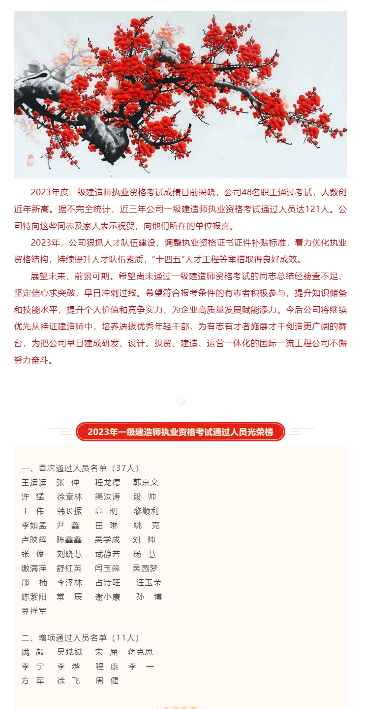 报喜|公司48名职工通过2023年度一级建造师执业资格考试