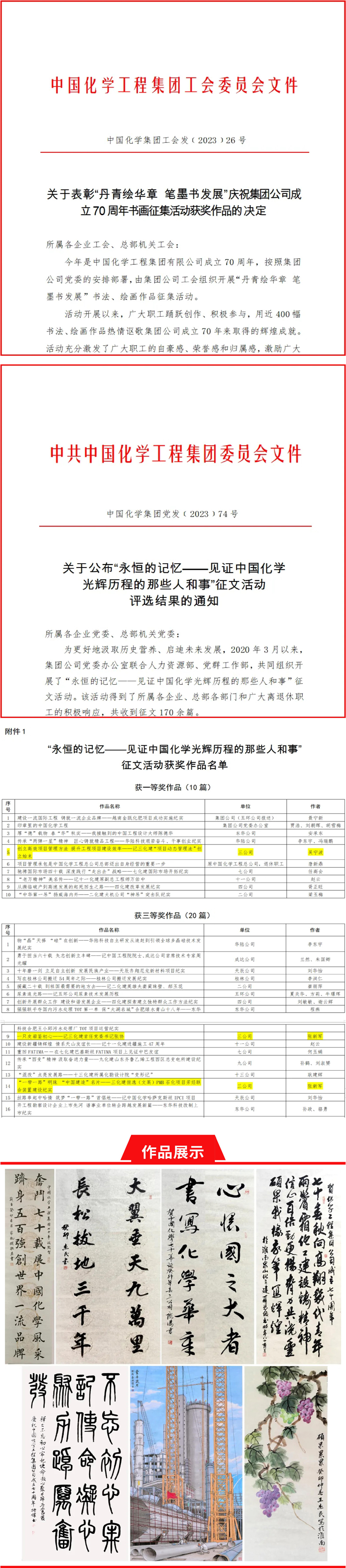 近日,集团公司公布了“永恒的记忆——见证中国化学光辉历程的那些人和事”征文和“丹青绘华章 笔墨书发展”庆祝集团公司成立70周年书画征集活动评选结果,公司9名职工创作的征文、书画作品榜上有名。 今年是集团公司成立70周年。公司党委积极响应集团公司成立70周年系列活动部署,广泛动员全体干部职工、离退休职工积极参与征文、书画创作。为保证报送集团公司的作品质量,展现公司干部职工、离退休职工较高的文艺素养,经基层单位推荐、公司党委筛选,择优向集团公司陆续报送征文作品10余篇、书画作品20余件。活动期间,公司报送的优质作品登上集团公司微信公众号,引起广泛关注与好评,取得了显著的传播效果。 经集团公司主责部门评审、专家审定,公司退休职工吴宁波创作的《创立高效项目管理方法 提升工程项目建设效率——记三化建“项目动态管理法”创立始末》荣获征文类“一等奖”,公司职工张新军创作的征文《一只皮箱鉴初心——记三化建首任党委书记张协》《“一带一路”明珠 “中国建造”名片——三化建恒逸(文莱)PMB石化项目芳烃联合装置建设纪实》荣获征文类“三等奖”;公司职工鹿伦山创作的《心怀国之大者 书写化学华章》以及退休职工夏恩俊、徐振杰、王杰民、潘家凯创作的《贺中国化学工程集团有限公司成立七十周年》《不忘初心 牢记使命》《奋斗岁月》《大翼垂天九万里 长松拔地三千年》《硕果累累》《奋斗七十载 跻身五百强》以及荣获书画类“优秀作品”表彰。以上作品均与集团公司70年发展历程和工程建设行业发展现状联系密切、息息相关,寓意深远、力透纸背,展现了公司职工、离退休职工较高的艺术认知和文学素养。