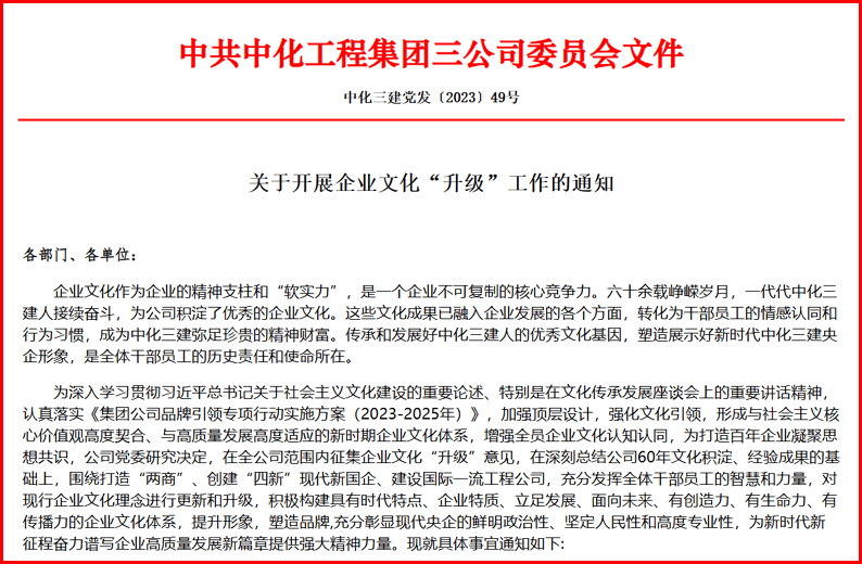 企业文化是企业的精神支柱和“软实力”,是一个企业不可复制的核心竞争力。本次企业文化“升级”工作得到广大干部职工的积极支持和热情参与,展现了一代代中化三建人传承红色基因、发扬优秀文化的使命担当,为构建有特色、有创造力、有生命力、有传播力的中化三建企业文化体系,传递有文化力、有竞争力、有战斗力的企业核心价值作出了积极贡献。
