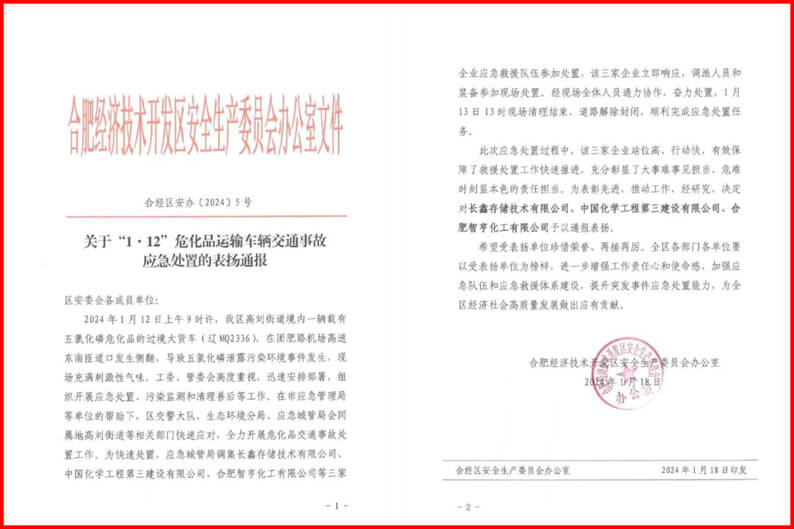 近日,安徽省合肥市经开区安委会发来通报,对中国化学三公司积极践行央企使命、迅速响应和参与“1.12”危化品运输车辆交通事故应急处置工作进行表扬。