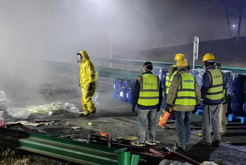 1月12日,一辆载有五氯化磷危化品的过境大货车,在行使至合肥市经开区高刘街道境内的团肥路机场高速东南匝道口处突然发生侧翻,导致危化品泄露污染环境事件发生,现场充满刺激性气体。合肥市经开区工委、管委会和合肥市应急管理局迅速安排部署,组织相关单位和部门开展应急处置、污染监测和清理善后等工作。三公司第一时间响应应急救援号召,安排距离事故现场最近的项目部组成救援队开展紧急救援。