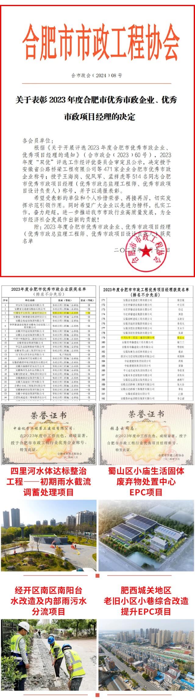 近日,合肥市市政工程协会组织开展2023年度合肥市优秀市政企业、优秀市政项目经理评选活动。经协会初审、市城乡建设局以及市城乡建设领域协会党总支核查、会长联席会研究审定,公司荣获“2023年度合肥市优秀市政企业”称号,这是公司总部搬迁合肥以来首次获得该项荣誉。同时,基础设施分公司四里河水体达标整治工程——初期雨水截流调蓄处理项目经理张喜云同志荣获优秀项目经理称号。