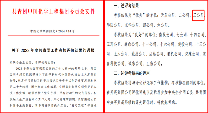 近日,中国化学工程集团有限公司团委公布了2023 年度共青团工作考核评价结果,公司团委再次获评集团公司2023年度共青团工作考核评价“优秀”等级,这是公司团委连续第三年获此殊荣,高质量做好共青团工作、服务企业改革发展得到集团公司团委的充分肯定。
