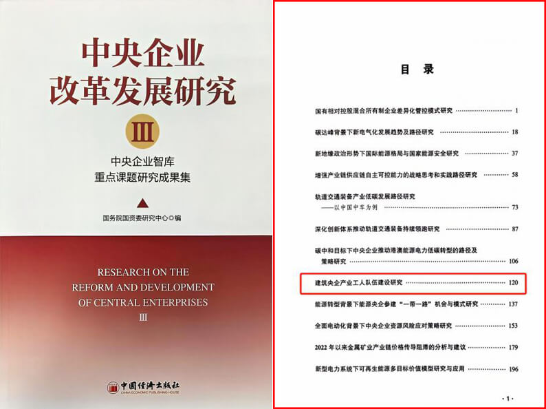 《中央企业改革发展研究:中央企业智库联盟重点课题研究成果集III》由中央企业智库联盟从2022-2023年度重点课题中遴选优秀课题研究成果汇编而成,收录了各中央企业智库及相关研究机构在国资国企改革方面的理论研究和实践案例。公司承担的《建筑央企产业工人队伍建设研究》课题以时代进步和行业变革为背景,客观分析社会经济、行业发展整体趋势、产业工人队伍结构及相关政策,深刻揭示了产业工人队伍建设的理论和实践意义,并结合行业和企业实际,提出加强产业工人队伍建设路径举措,具有较强的实践和推广价值,获得国资委研究中心和中央企业智库联盟的充分肯定。此前,该课题荣获国资委中央企业智库联盟2022年度重点课题研究成果二等奖。