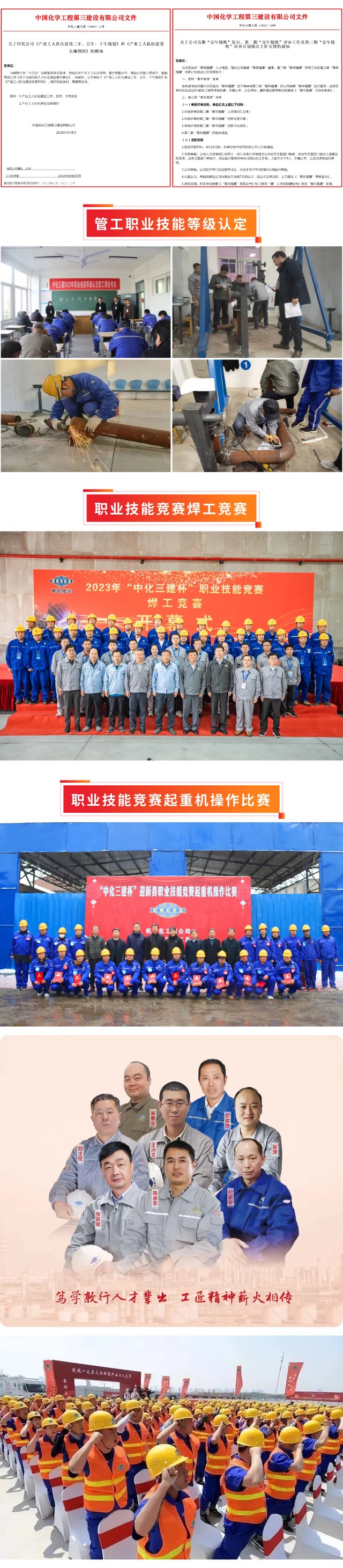 作为“全国能源化学地质系统产业工人队伍建设改革示范单位”和“十大产业百家企业专项行动企业”,近年来,公司持续优化产业工人队伍结构、提升技能水平、增强企业核心竞争力,制定《产业工人队伍建设三年、五年、十年规划》和《产业工人队伍建设实施细则》,明确产业工人队伍建设工作的指导思想、目标方向、实施路径、保障措施;积极构建“新八级工”产业工人职业发展通道,利用能够自主开展职业技能等级认定的条件,分阶段开展技能等级标准编制和认定工作,大力实施“青年精鹰”评选和“蓝‘鹰’护航”之“一十百千”工程,为各类技能人才架起“成长阶梯”;组织开展管工职业技能等级认定、“中化三建杯”职业技能竞赛焊工竞赛、起重机操作比赛等活动,大力营造尊重劳动、尊重知识、尊重人才、尊重创造的浓厚氛围,引导更多产业工人立足岗位、钻研业务、苦练技能。一系列举措对推进公司产业工人队伍建设改革,加快建设一支宏大的知识型、技能型、创新型产业工人大军,切实提高企业核心竞争力和专业保障能力,激励更多技术工人走技能成才、技能强企、技能报国之路,培养更多高技能人才和“大国工匠”提供了有力支撑。