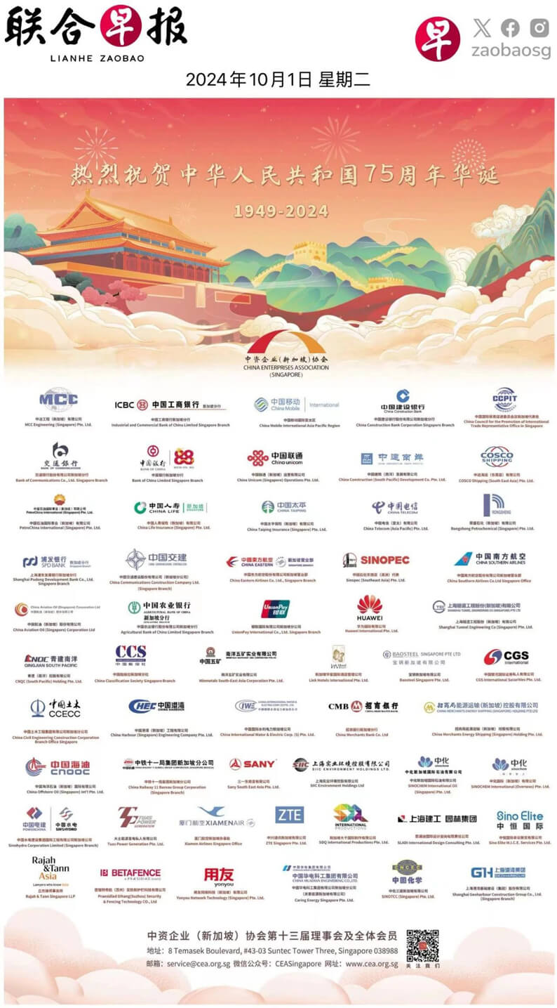 国庆之际,新加坡《联合早报》刊发“热烈祝贺中华人民共和国75周年华诞”版面。应中资企业(新加坡)协会邀请,米兰平台新加坡公司同协会第十三届理事会及全体会员单位共同参加“国庆特辑” 品牌商标宣传展示活动,庆祝中华人民共和国75周年华诞。