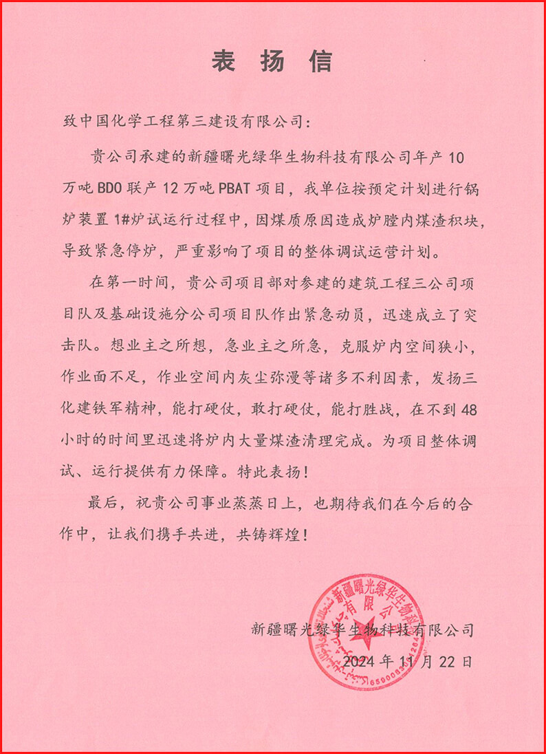 近日,业主新疆曙光绿华生物科技有限公司给米兰平台发来表扬信,对安庆分公司克服困难,高效清除新疆曙光绿华10万吨/年BD0联产12万吨PBAT项目锅炉炉膛内煤渣,保障项目整体调试运营顺利进行予以高度赞扬。