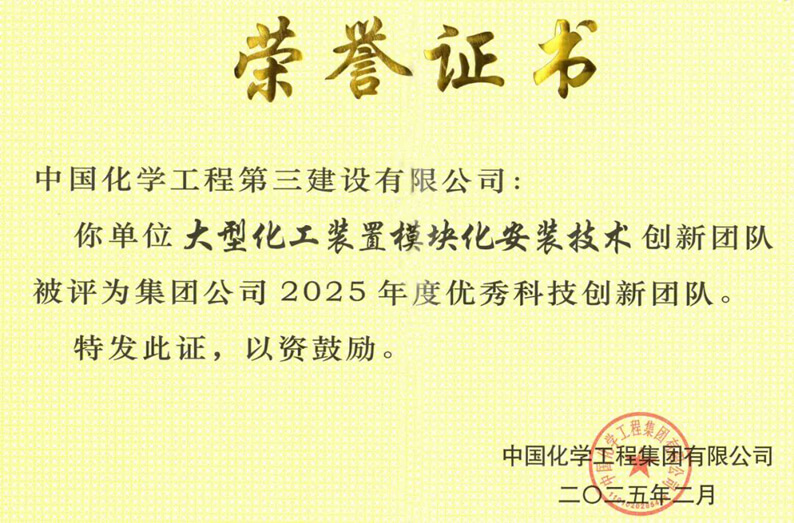 2月8日,中国化学2025年度高质量发展暨科技创新大会在北京召开。会上,中国化学三化建大型化工装置模块化安装技术创新团队荣获“优秀科技创新团队”称号。这一荣誉不仅是对团队辛勤付出的充分褒奖,更是对公司科技创新实力的高度肯定。 公司大型化工装置模块化安装技术创新团队围绕集团发展战略,以科技创新和价值创造为核心,开展了一系列开创性工作,成功研发出大型化工装置钢结构模块分割技术、管道模块分割技术、模块拼装技术、模块整体组装技术、运输道路地基处理技术、模块运输技术、模块安装就位技术以及管道“黄金口”安装技术等八项综合技术。这些技术通过高度集成、一体化组装,形成了一套完整的大型化工装置模块化施工技术体系,填补了公司在该领域的技术空白,使公司大型化工装置模块化施工技术达到国内先进水平。目前,该技术已成功通过中国化工建设企业协会鉴定,相关工法获得安徽省级工法、化工施工部级工法以及集团级工法。同时,团队获得1项发明授权和2项实用新型专利授权。 大型化工装置模块化安装技术在新加坡林德气化技改项目中的成功应用,为项目优质高效建成提供了有力支撑。该项目荣获中国工程建设焊接协会“2024年度工程建设全面焊接质量管理成果一等奖”以及中国化工建设企业协会“2024年AAA级境外优质工程奖”。 同时,公司与科研总院、中国科技大学合作的“高能长时储能镍氢气电池的开发及示范应用项目”入选首批中国化学“星火计划”重大科技攻关项目。