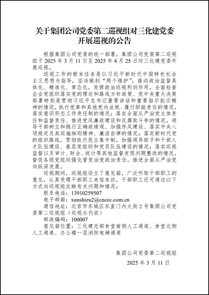关于集团公司党委第二巡视组对三化建党委开展巡视的公告