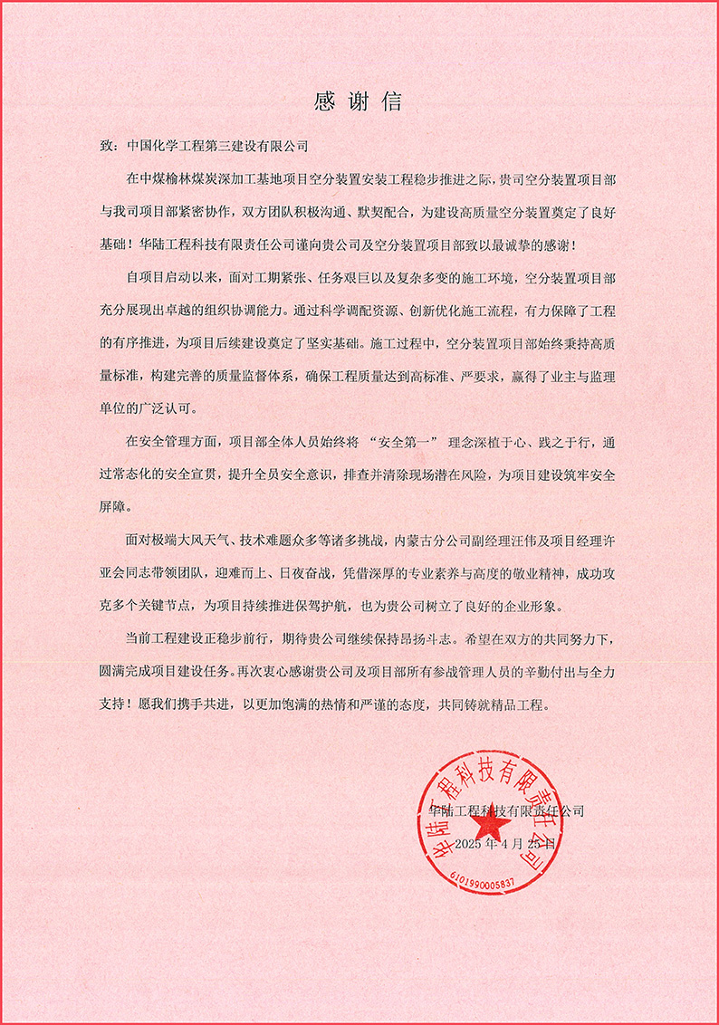 近日,米兰平台收到华陆工程科技有限责任公司发来的感谢信,对内蒙古分公司在中煤榆林煤炭深加工基地项目空分装置安装工程中的出色表现给予高度评价,对项目部全体人员的辛勤付出和卓越贡献表示衷心感谢,并期待双方在未来的工程建设中继续携手共进,共铸精品工程。