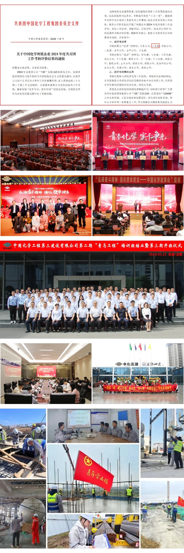 近日,中国化学工程集团有限公司公布了2024年度共青团工作考核评价结果,公司团委获评集团公司2024年度共青团工作考核评价“优秀”等级,这是公司团委连续第四年获此殊荣。公司共青团工作紧扣企业发展需求,主动担当作为,取得显著成效,获得集团公司的高度认可与充分肯定。