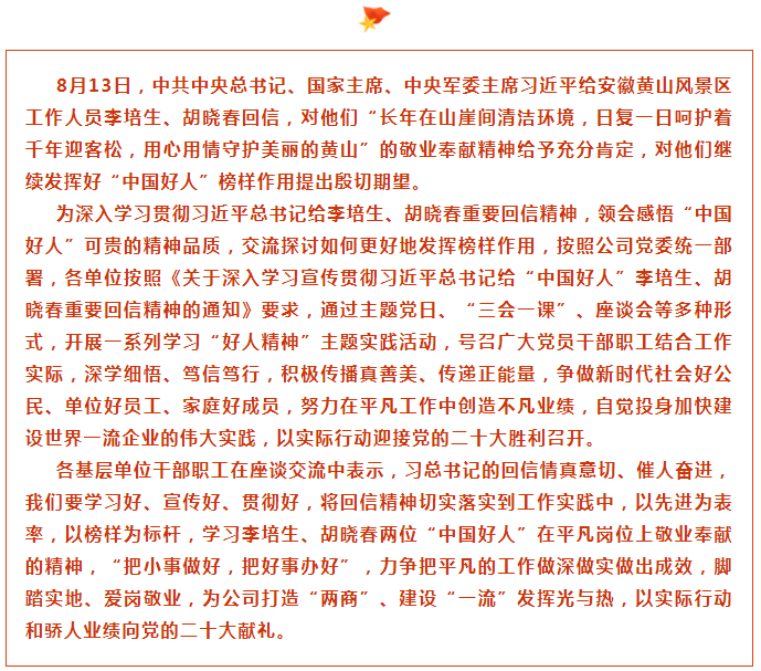 喜迎二十大 汇聚正能量|各单位学习贯彻习近平总书记给“中国好人”李培生胡晓春重要回信精神