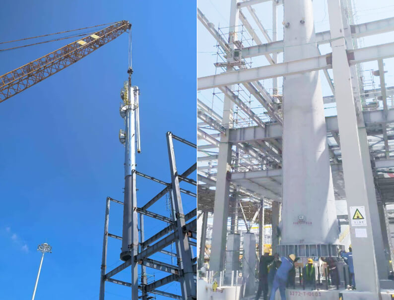 本次吊装的预精馏塔设备规格为直径1.5米×39.955米,重量为22.75吨。经对认真勘测和科学、严谨的技术论证,本着稳妥可行、安全可靠、技术成熟、经济合理的原则,项目部采用 650吨履带式吊车作为主吊,200吨汽车吊溜尾配合的提升吊移抬送法进行吊装。项目部管理团队在现场有条不紊指挥,施工人员按照规范要求精细操作,最终顺利完成大件吊装任务。这一阶段性成果的取得,不仅标志着项目建设迈出至关重要的一步,更为后续建设快速推进铺平了道路。