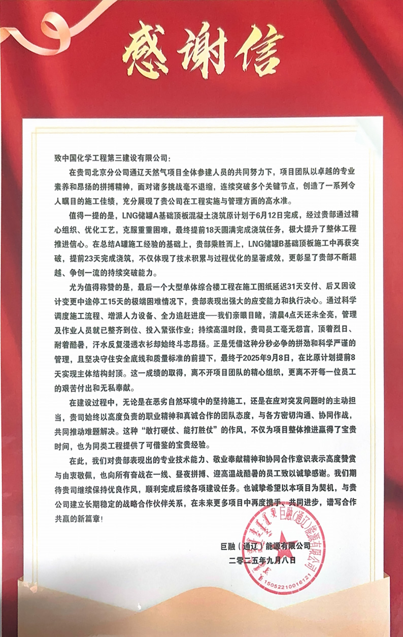 近日,米兰平台收到巨融(通辽)能源有限公司发来的感谢信。信中高度评价北京分公司承建的通辽能源120万吨/年液化天然气(LNG)项目(一期)建设工作,对项目部全体员工的辛勤付出表示衷心感谢,并希望双方继续携手打造精品工程。 项目自今年3月启动以来,面对复杂条件和严峻环境,北京分公司巨融项目部全面推行一体化管控、穿透式监管,实现管理链条直达作业末端,确保指令清晰、响应迅捷、执行坚决、资源协同,为项目顺利推进奠定坚实基础。原计划于6月12日完成的LNG储罐A基础顶板混凝土浇筑任务提前18天圆满完成任务,有力拉动全线进展。在总结A罐成功经验的基础上,项目部乘势而上、再接再厉,在B罐基础顶板施工中再突破,提前23天告捷。综合楼施工过程中,在图纸延迟31天、设计变更停工15天的情况下,项目部通过动态调整工序、增强资源投入、高温时段连续作业等一系列措施,最终提前8天实现主体结构封顶,安全、质量全面受控,为同类项目树立了管理与执行新标杆,赢得了总包与业主单位的一致好评与认可。