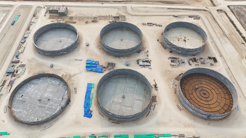 安哥拉公司在安哥拉洛比托炼油厂项目的重要施工任务之一是6台10万立方米大型原油储罐群的安装。储罐单罐直径达 87米、设计高度17.65米,均采用外浮顶结构,是安哥拉炼油厂项目原油存储领域的 “重量级装备”,而浮船作为储罐的“心脏”部件,直接关系到原油存储的安全性与稳定性。此次安装的A储罐是6台大型原油储罐之一,A储罐浮船主体结构由463张底板、593支桁架及 538张顶板组成,总重量约730吨,仅浮船焊缝长度就达 2.2万米,相当于绕标准操场55圈。面对储罐浮船安装的“重、难、险”施工难题,项目总工带领技术团队,反复研讨、修改施工方案,引进曾参与多个国内外重点能源项目建设,具备应对复杂工况的专业人员从事施工,严格构建多维度安全防护体系,以“科技+良将+制度”为项目施工保驾护航。