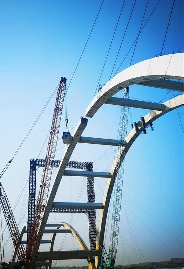 十六号路跨海桥桥体主跨跨径200米,高61.5米,宽48.6米,拱肋重量大、吊装难度高。受疫情影响,现场一度封闭1月有余。第二建安工程公司积极创造条件,利用现场仅有的资源开展各项准备工作。随着疫情好转,他们迅速着手主跨安装,在保证安全质量、做好疫情防控的前提下,不断加快建设进度,仅用1个月时间,就顺利完成主跨19段近1400吨的拱肋安装。主跨合龙段安装条件极为苛刻,为避免日照对合拢段尺寸精度产生的影响,他们连续1周在凌晨4点前测量合拢段两端尺寸。全体参战员工每日凌晨2点就奔赴现场,精确测量、精准下料,保质保量完成了难度最大的主跨合龙。