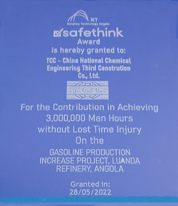 庆典仪式上,总包KT公司对中化三建为项目建设安全高效推进作出的突出贡献表示敬意和感谢,授予公司300万安全工时奖牌。公司安哥拉项目经理部经理张雷登台接受嘉奖。