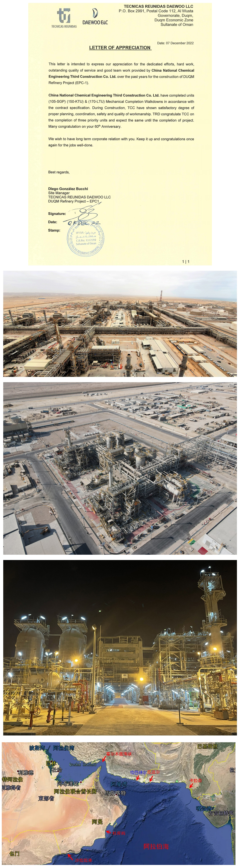 近日,阿曼杜库姆炼油项目联合总包西班牙TR公司与韩国大宇公司给公司发来感谢信,对公司承建的阿曼杜库姆炼油EPC1包U105饱和气体厂、150液化石油气装置与170柴油加氢装置实现高标准机械竣工表示祝贺与感谢。