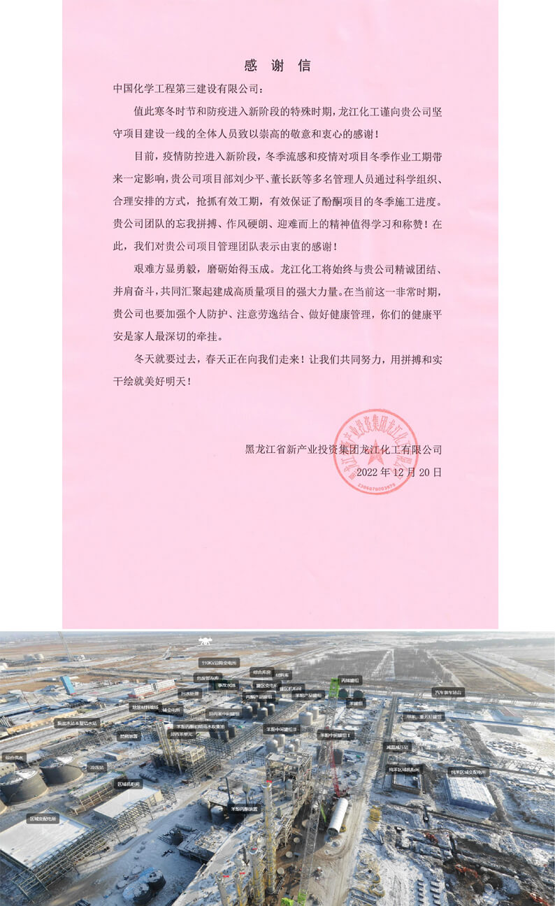 近日,黑龙江新产业投资集团龙江化工有限公司给公司发来感谢信,对公司强化施工组织,有效保障龙江化工35万吨/年苯酚丙酮项目冬季施工进度表示感谢。