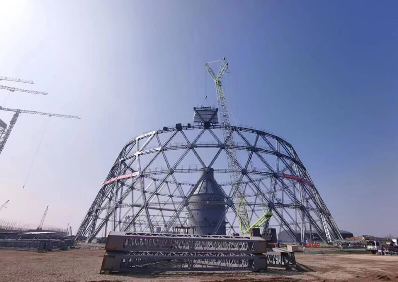 该项目位于革命老区甘肃省庆阳市正宁县周家镇,是我国首个千万千瓦级“风光火储输”多能互补绿色智慧综合能源基地重要组成部分,是世界首座集主机冷却塔、辅机冷却塔、脱硫吸收塔、CCUS系统原烟道、烟囱于一体的“五塔合一”系统。项目包括内置蒙皮安装、外置加强环安装等9项科技创新亮点,是公司首次承建加强环外置、蒙皮内置的钢结构间冷塔项目。