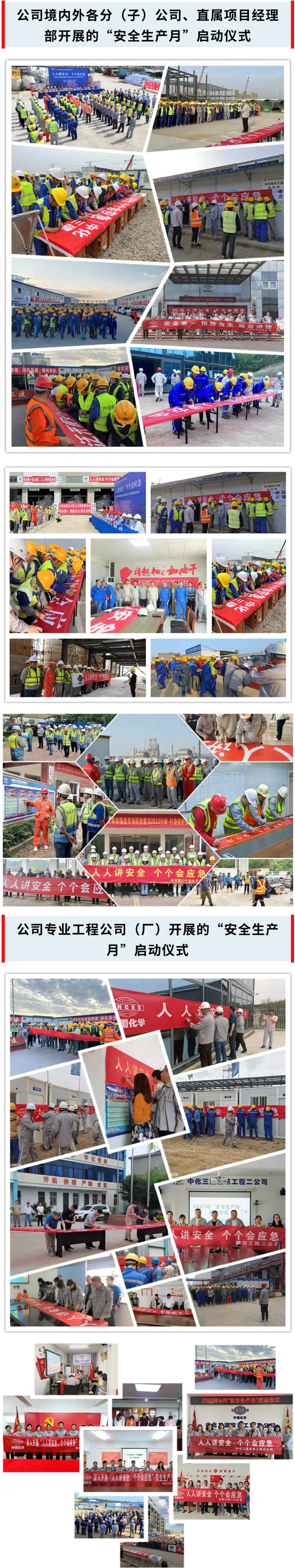 为开展好全国第22个“安全生产月”活动,持续深入贯彻“工作落实年”“安全管理强化年”和重大事故隐患专项排查整治2023行动要求,进一步推动落实安全生产十五条硬措施,按照国务院安委会办公室、应急管理部、集团公司2023年“安全生产月”活动的各项工作部署,继合肥总部机关、淮南各单位举行2023年“安全生产月”启动仪式后,6月伊始,境内外各分(子)公司、直属项目经理部、专业工程公司(厂)等按照《关于开展2023年“安全生产月”活动的通知》要求,迅速组织开展“安全生产月”启动仪式。