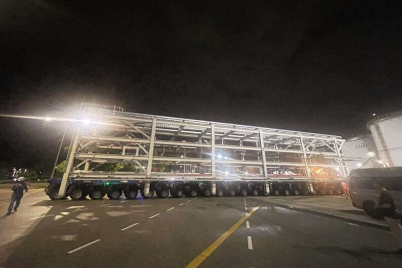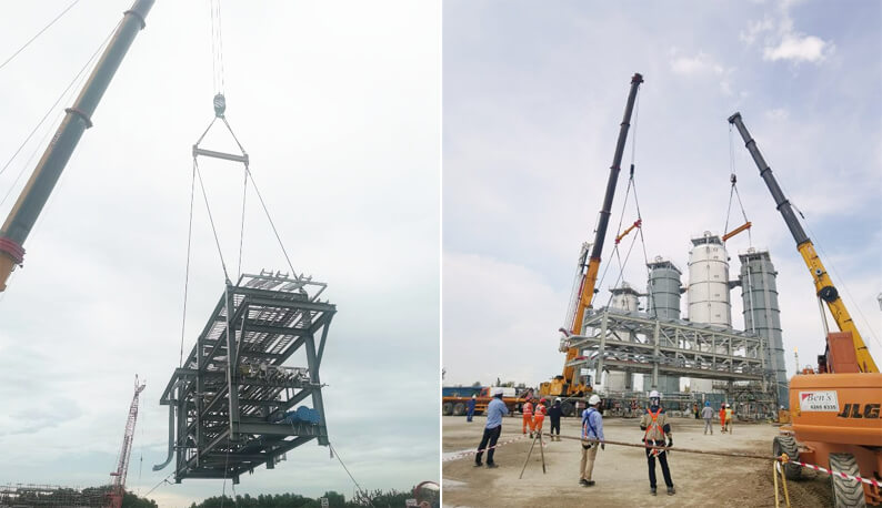 新加坡有限公司承建了该项目土建、钢结构、防腐保温、电气仪表等全部工程建设任务。该项目管廊采用26组模块化安装方式,共计1756.3吨,其中6组共计859.7吨,采用SPMT运输车直接运输至基础进行安装;20组共计896.6吨,采用吊车进行安装;单组模块最重120.7吨,由2台500吨汽车吊抬吊。自2022年9月开工以来,项目部克服施工场地狭小、运输难度大、安装时间紧等困难,精心制定运输与吊装方案,合理计划模块进厂顺序,采取24小时轮施工保障项目节点。有限公司、项目部切实把新加坡政府、业主、集团公司和公司的各项工作部署落实落细,结合现场实际,科学组织、合理调度、精心谋划,充分发掘团队潜能,营造了众志成城、攻坚克难的大干氛围。全体参战员工发扬“敢于亮剑,勇于拼搏”精神,瞄准节点,逐个突破,经过艰苦鏖战,安全优质高效完成26组模块安装任务,赢得各方高度赞誉,为后续工程的加快推进提供了有力保障。