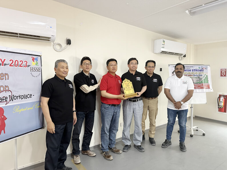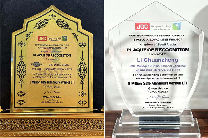 近日,公司承建的沙特南加瓦气体分离装置及配套设施项目荣获总包方日挥海湾国际工程公司颁发的“800万安全工时”奖牌。