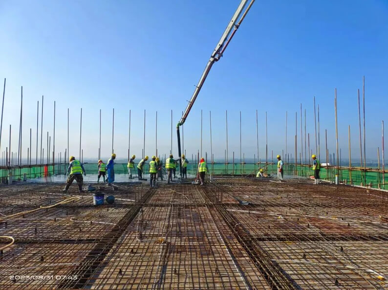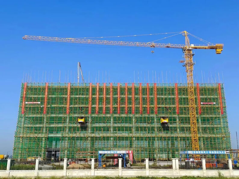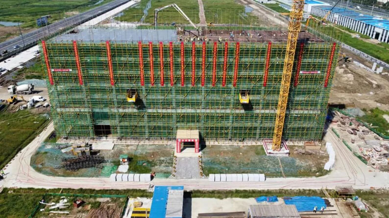 连云港有限公司承建了该项目厂房、仓库、综合楼、门卫室及消控室、地下消防水池、废水池、氧化线水池、室外道路、雨污水、给水、路灯、绿化等工程。自2023年7月开工以来,有限公司、项目部团结带领各参战单位,克服工期紧、任务重、施工组织管理难度大等难题,坚持挂图作战、挂责问效、保障有力,结合工程特点,定措施、排计划,调集精兵强将,合理配置资源,精心组织现场施工,确保项目建设平稳有序全面受控。广大党员干部冲锋在前,当先锋、作表率,用实干精神诠释忠诚与担当。全体参战员工铆足干劲、加班延点,高标准、严要求、快节奏强力推进项目建设,历时仅一个半月,胜利实现项目综合楼封顶,较原计划提前15天完成这一重大节点目标,充分彰显了公司优质的施工组织和综合协调能力,树立了良好的企业品牌形象,赢得业主及各方高度赞誉,为公司巩固拓展江苏及周边市场创造了有利条件。